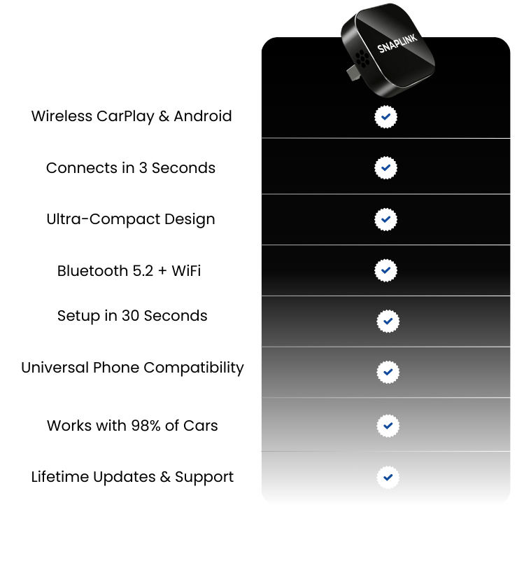 Tired of messy cables and constant plugging in? With SnapLink, you get instant Wireless CarPlay in seconds—just set it up once and your phone connects automatically every time you start the car. No wires. No hassle. Just drive.